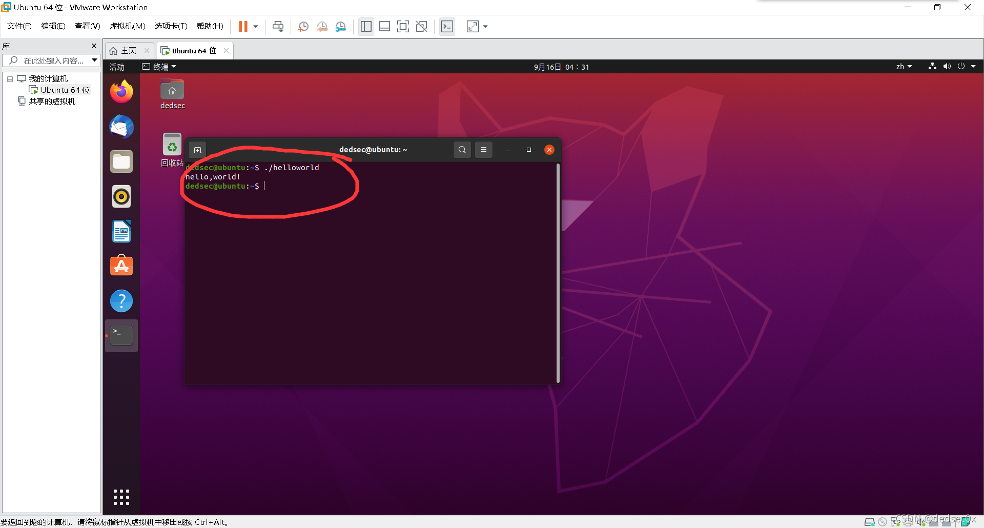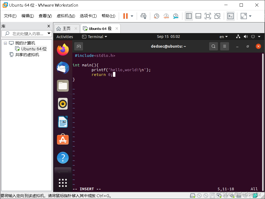 创建.c文件, vim helloworld.c,编写并保存(ESC退出编辑模式,然后输入:wq保存并退出)