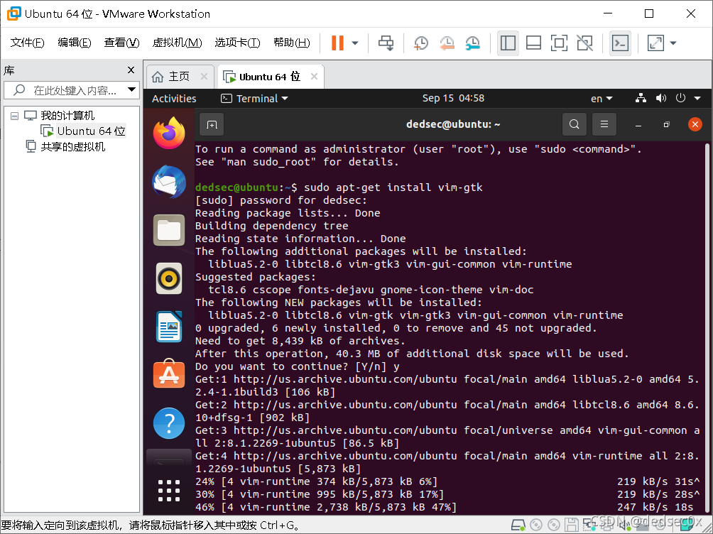 首先启动虚拟机并打开终端,输入sudo apt-get install vim-gtk,然后输入密码安装vim