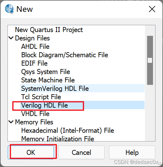 菜单栏中找到File→New,在Design Files一栏中选择Verilog HDL File,然后点OK。