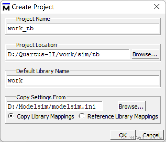 打开Modelsim,File→change Directory,将文件夹改为创建的工程文件夹,然后在Modelsim中建立工程File→New→Project