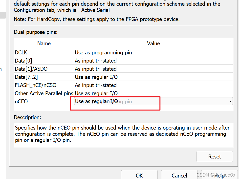 左侧Category一栏中选择Dual-Purpose Pin。将引脚改成Use as regular I/O。