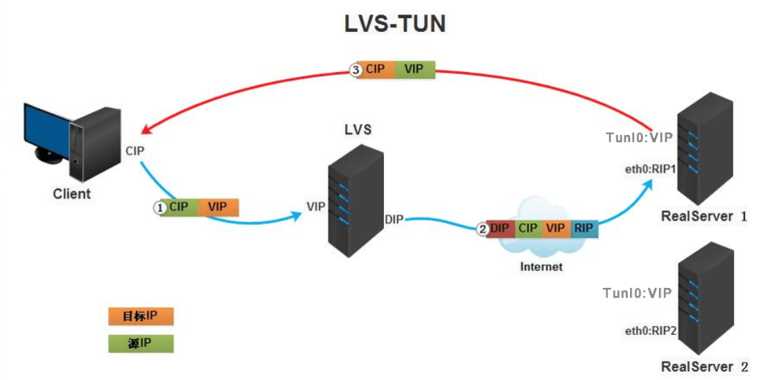 IP 隧道:IP Tunnel,简称:TUN 模式,采用开放式的网络结构,负载调度器作为客户机的访问入口,各节点通过各自的 Internet 连接直接回应给客户机,而不经过负载调度器,服务器节点分散在互联网中的不同位置,有独立的公网 IP 地址,通过专用 IP 隧道与负载调度器相互通信。