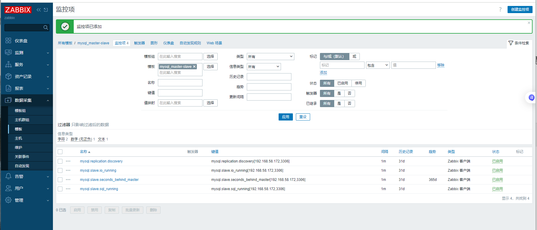 [root@zabbix zabbix_agentd.d]# zabbix_get -s 192.168.58.172 -k "mysql.slave.seconds_behind_master"[192.168.58.172,3306] 0 [root@zabbix zabbix_agentd.d]# zabbix_get -s 192.168.58.172 -k "mysql.slave.io_running"[192.168.58.172,3306] Yes [root@zabbix zabbix_agentd.d]# zabbix_get -s 192.168.58.172 -k "mysql.slave.sql_running"[192.168.58.172,3306] Yes