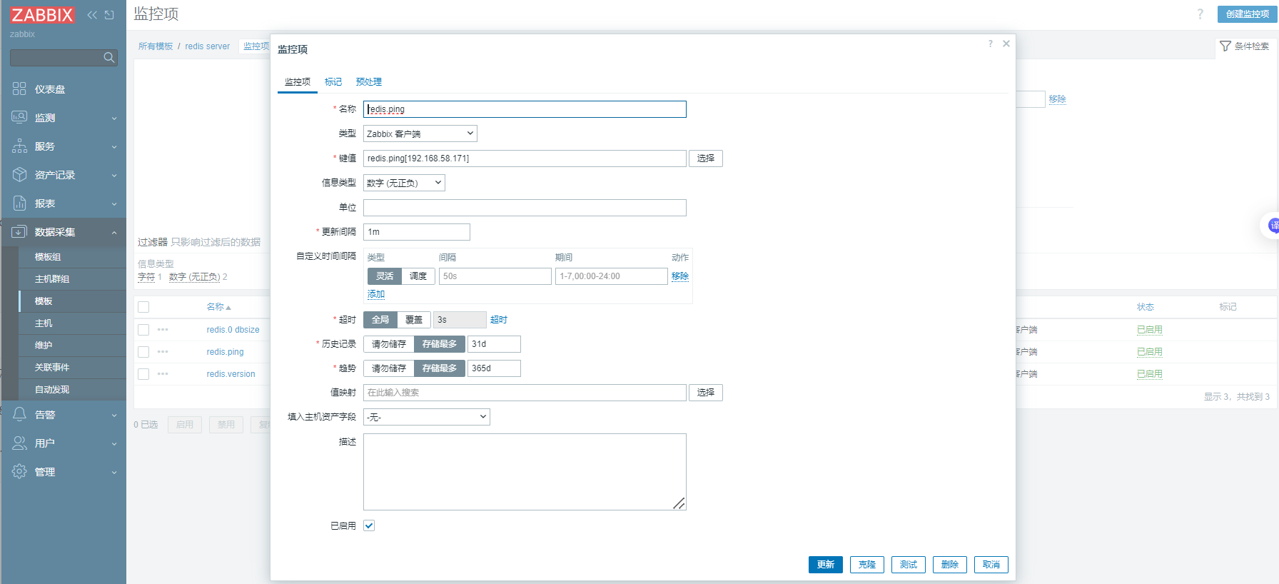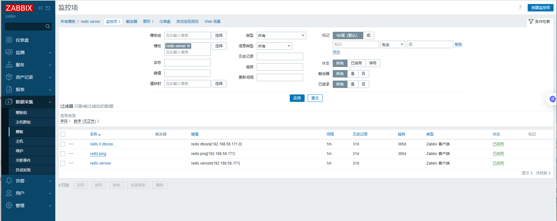 [root@zabbix ~]# zabbix_get -s 192.168.58.171 -p 10050 -k redis.ping[192.168.58.171] 1 [root@zabbix ~]# zabbix_get -s 192.168.58.171 -p 10050 -k redis.version[192.168.58.171] 6.2.18 [root@zabbix ~]# zabbix_get -s 192.168.58.171 -p 10050 -k redis.dbsize[192.168.58.171] 3