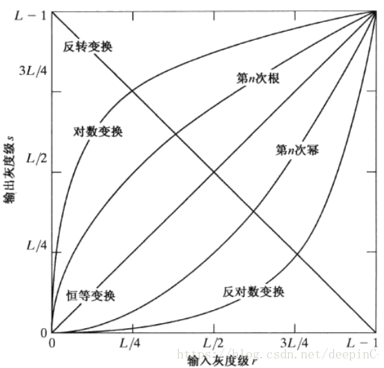 各种函数公式如下,其中 ccc 表示任意常数,rrr 表示输入的像素值,sss 表示输出的像素值- 反转变换:s=(L−1)−rs = (L - 1) - rs=(L−1)−r —— 黑变白,白变黑