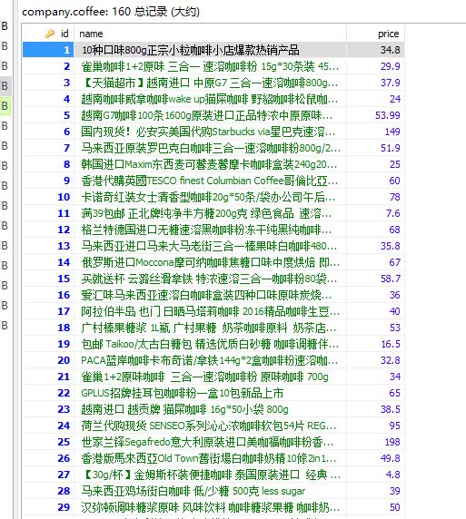 import requests import re import pymysql def getHTMLtext(url): try: r=requests.get(url,timeout=100) r.raise_for_status() r.encoding=r.apparent_encoding return r.text except: return "" def getpage(itl,html): try: plt=re.findall(r'"view_price":"[\d.]*"',html) nlt=re.findall(r'"raw_title":".*?"',html) for i in range(len(plt)): price = eval(plt[i].split(':')[1]) title = eval(nlt[i].split(':')[1]) itl.append([price, title]) except: print("") def printgoods(itl): tplt = "{:2}\t{:8}\t{:16}" print(tplt.format("序号", "价格", "商品名称")) count = 0 conn = pymysql.connect(host='127.0.0.1', user='root', password='123456', db='company',charset="utf8") cur = conn.cursor() sqlc = ''' create table coffee( id int(11) not null auto_increment primary key, name varchar(255) not null, price float not null)DEFAULT CHARSET=utf8; ''' try: A = cur.execute(sqlc) conn.commit() print('成功') except: print("错误") for g in itl: count = count + 1 b=tplt.format(count, g[0], g[1]) sqla = ''' insert into coffee(name,price) values(%s,%s); ''' try: B = cur.execute(sqla,(g[1],g[0])) conn.commit() print('成功') except: print("错误") # save_path = 'D:/taobao.txt' # f=open(save_path,'a') # # f.write(b+'\n') # f.close() conn.commit() cur.close() conn.close() def main(): goods="咖啡" depth =2 start_url='https://s.taobao.com/search?q='+goods List =[] for i in range(depth): try: url =start_url +"&s="+ str(i*44) html=getHTMLtext(url) getpage(List,html) except: continue print(printgoods(List)) # savefiles(data) main()