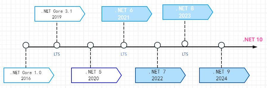 🔚 最后版本:**.NET Core 3.1**(2019 年发布,LTS 支持到 2022 年底)