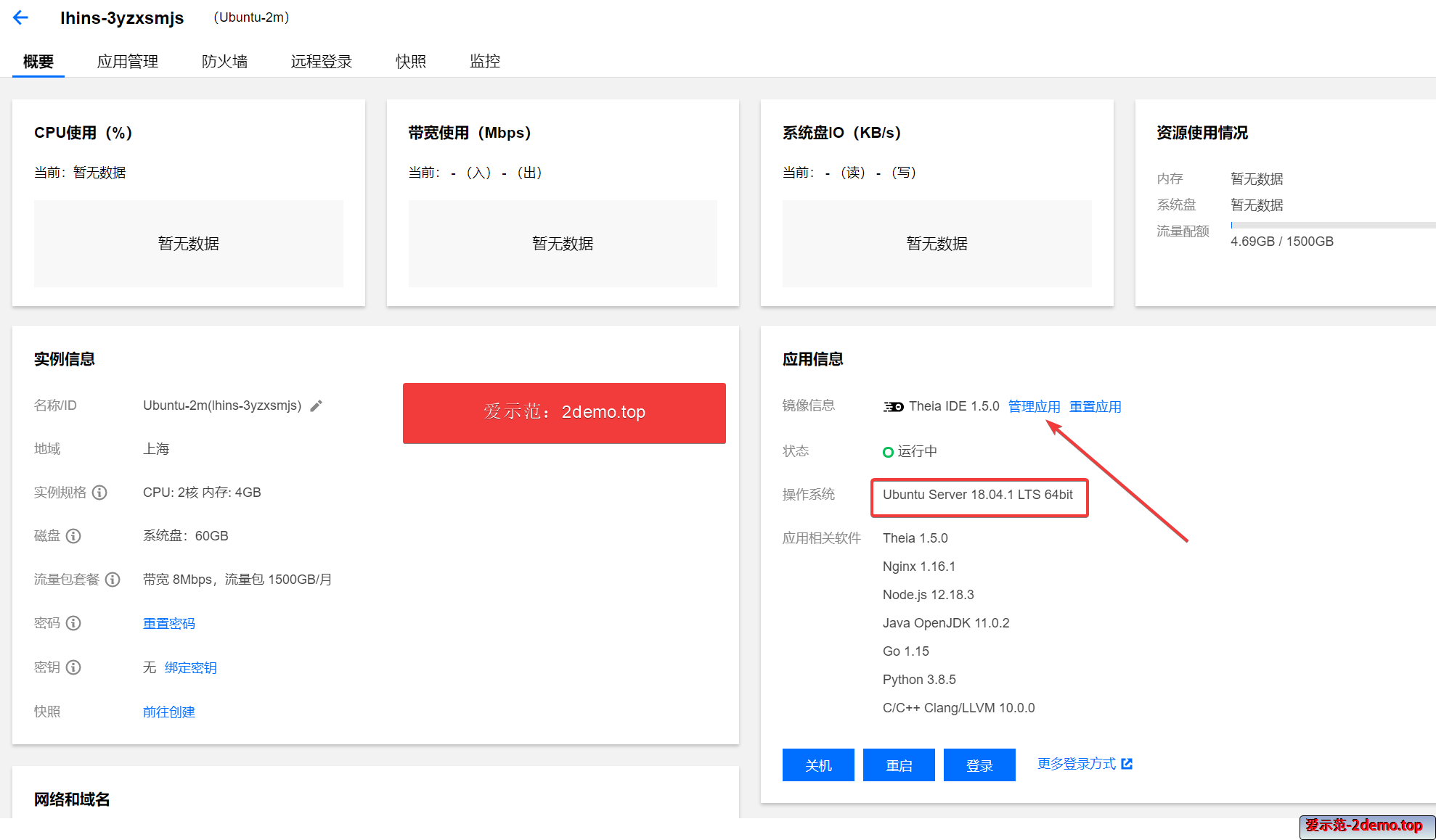 这是安装结束之后的界面,可以看出是基于Ubuntu Server 18.04 LTS 64bit版本,点击管理应用。