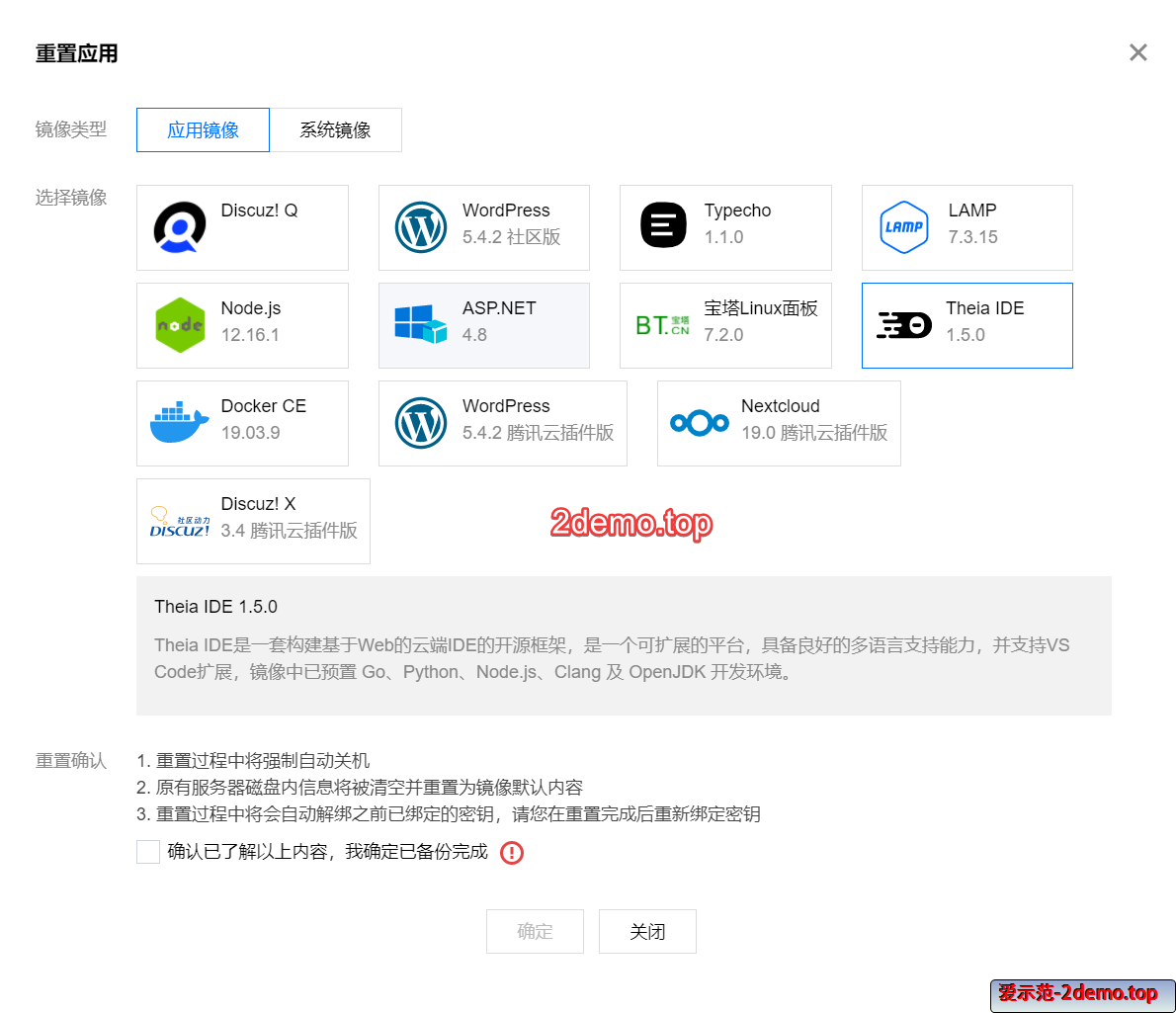 腾讯云服务器的镜像中的Theia IDE是1.5.0版本具有,官方最新版本是1.9版本。内置了Go、Python、Node.js、Clang及OpenJDK开发环境。