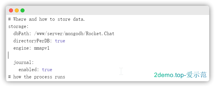 storage: dbPath: /www/server/mongodb/Rocket.Chat directoryPerDB: true engine: mmapv1