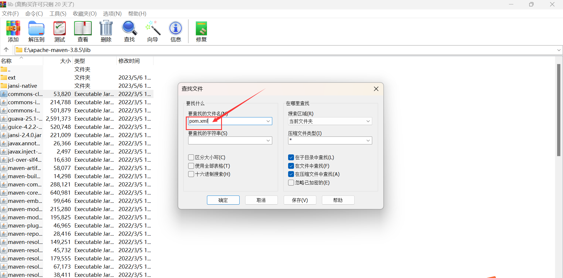1.用winrar随便打开一个E:\apache-maven-3.8.5\lib下的jar,然后返回上级目录,搜索pom.xml
