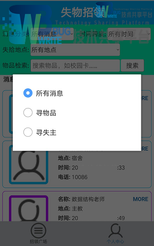 可以发布丢失物品和捡拾物品的信息,浏览以往发布的信息并提供搜索功能。在物品成功归还后可以撤销已经发布的消息。首页,即广场,展示已经发布的物品的消息,按时间排序展示,有多种分类: