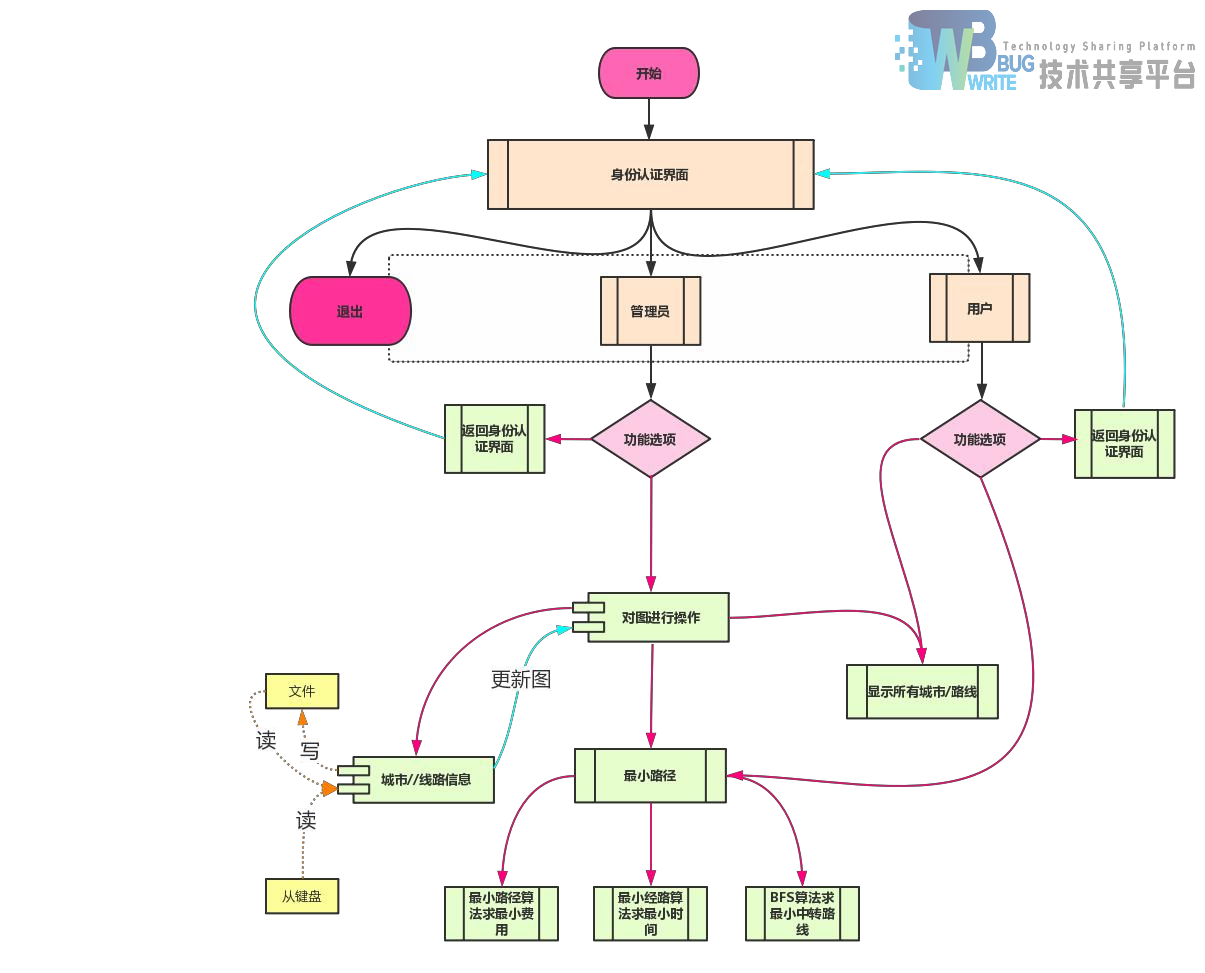提供用户以及管理员功能,用户可以对交通图进行查询,而管理员可以对交通图进行增删查改,同时管理员可以登陆、修改密码等待操作,界面采用字符界面。这样操作,更加真实地模拟了交通咨询系统。关于要求的功能,实现了城市线路的增加、删除、显示,基于 Dijkstra 的从源点到汇点的最小费用算法与最小时间算法。