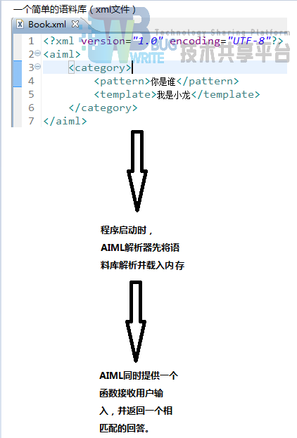 语料库中的pattern是模式的意思,可理解为问题,而相应的template可理解为回答(而这一对问答被包裹在了category标签里面)。假如你的语料库像上面的xml文件这样简单,那么当你输入“你是谁”,机器人就会在内存中去一个一个的匹配pattern,最后匹配到了,就会回答“我是小龙”,而你输入其他任何语句,机器人就无从匹配了,程序会出现匹配不到的错误。那么怎样避免程序出错呢?我们修改语料库如下: