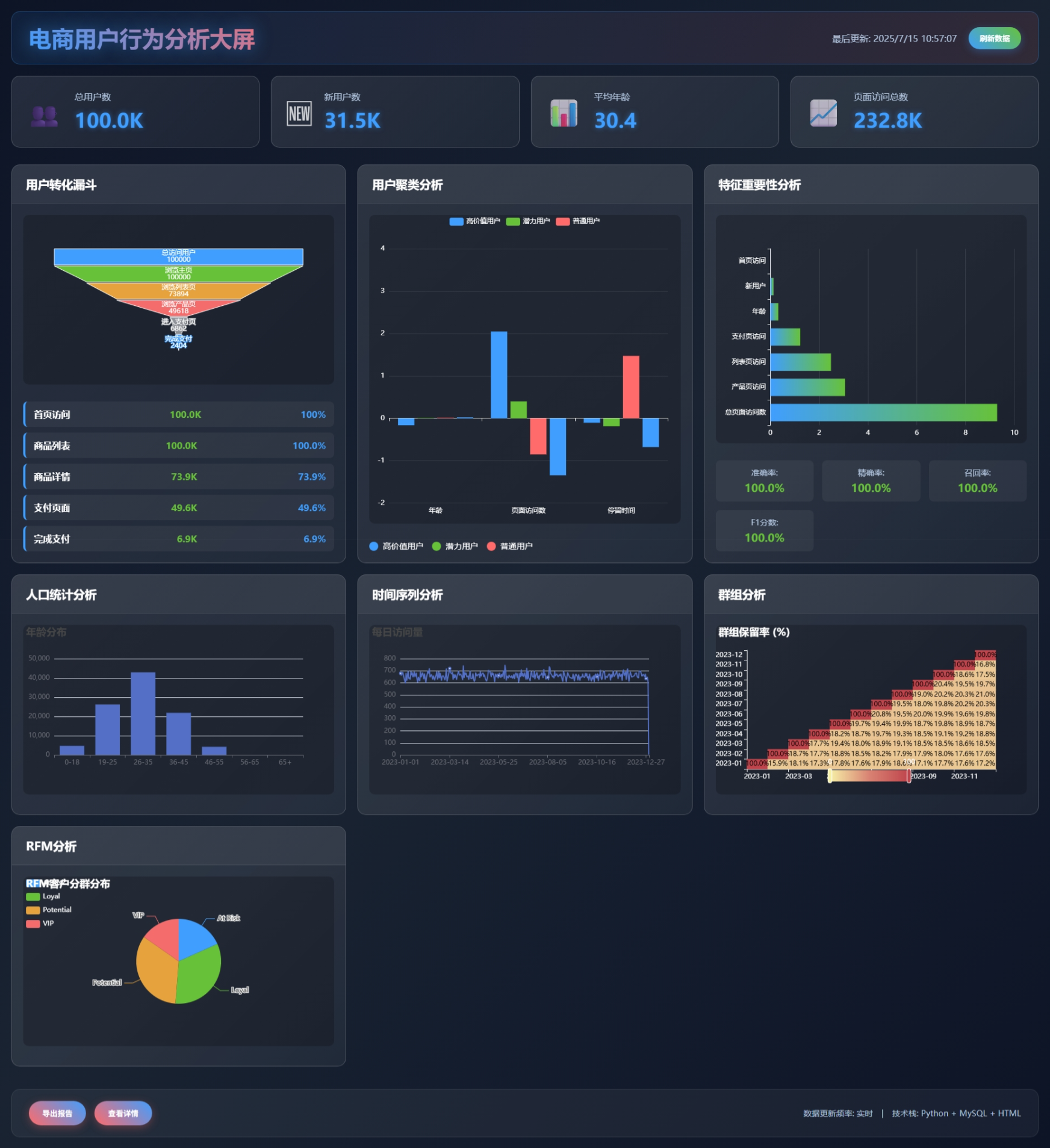 这是一个基于现代技术栈构建的企业级电商数据分析平台,旨在通过先进的数据处理、深度统计分析和直观的数据可视化,为电商企业提供全面的用户行为洞察和业务决策支持。该平台集成了数据科学、机器学习和Web开发的最佳实践,为企业数字化转型提供强有力的技术支撑。