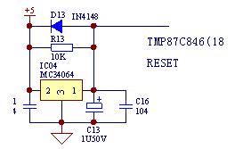 图4 上电复位电路原理图 上电复位电路原理分析 5V电源通过MC34064的2脚输入,1脚便可输出一个上升沿,触发芯片的复位脚。电解电容C13是调节复位延时时间的。当电源关断时,电解电容C13上的残留电荷通过D13和MC34064内部电路构成回路,释放掉电荷。以备下次复位启用。 四、上电复位电路的关键性器件 关键性器件有:MC34064 。