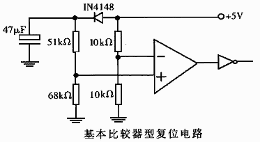 比较器型复位电路的基本原理如图8所示。上电复位时,由于组成了一个RC低通网络,所以比较器的正相输入端的电压比负相端输入电压延迟一定时间。而比较器的负相端网络的时间常数远远小于正相端RC网络的时间常数,因此在正端电压还没有超过负端电压时,比较器输出低电平,经反相器后产生高电平。复位脉冲的宽度主要取决于正常电压上升的速度。由于负端电压放电回路时间常数较大,因此对电源电压的波动不敏感。但是容易产生以下二种不利现象:(1)电源二次开关间隔太短时,复位不可靠;(2)当电源电压中有浪涌现象时,可能在浪涌消失后不能产生复位脉冲。为此,将改进比较器重定电路,如图9所示。这个改进电路可以消除第一种现象,并减少第二种现象的产生。为了彻底消除这二种现象,可以利用数字逻辑的方法与比较器配合,设计如图9所示的比较器重定电路。此电路稍加改进即可作为上电复位与看门狗复位电路共同复位的电路,大大提高了复位的可靠性。
