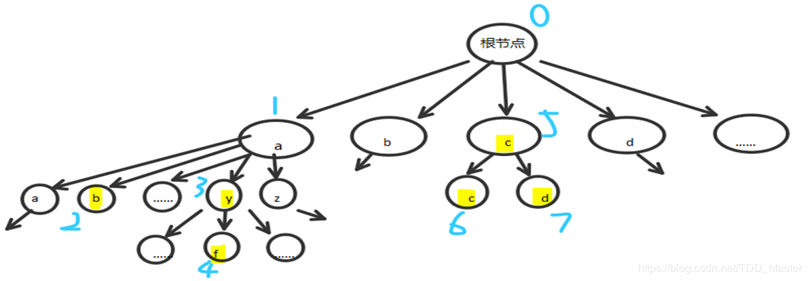 顺序存储字符串:“ab”“ay”“ayf”“c”“cc”“cd”……(节点编号讲究先到先得)