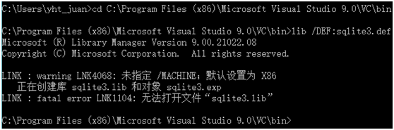 6)执行LIB /DEF:SQLITE3.DEF /MACHINE:IX86或LIB /DEF:SQLITE3.DEF 即可生成sqlite3.lib文件。