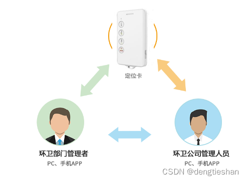 环卫工人携带智能定位卡,按照规范作业,实时上报作业数据。环卫部门和环卫公司的管理人员,使用电脑后台和手机App,进行监督管理、问题指派。