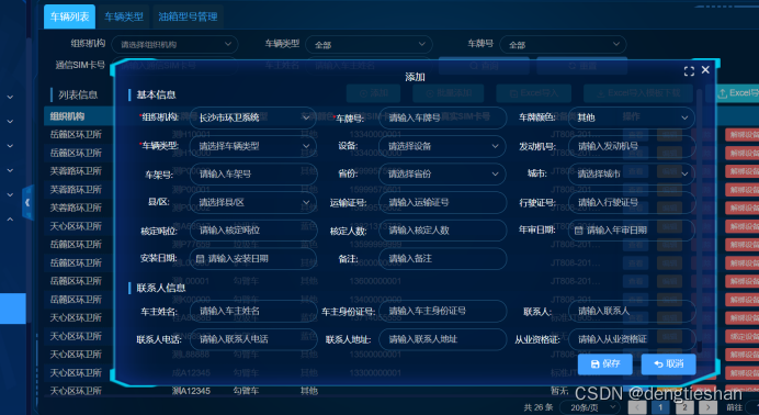 对车辆的司机和车辆信息统一管理,对司机的姓名、电话、部门职务、照片等信息进行管理,并在地图直观展示,方便督查人员路面检查和对大型车辆的管理;还可以为车辆设置单独的部门,进行分类管理。每个车辆创建车辆档案,登记车辆基本信息,记录车辆号码、车辆型号、车辆状况、百里油耗量。