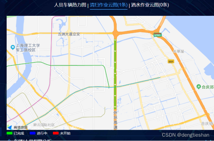 规范化管理作业过程,系统实时反映哪些路段按规范要求启动了作业开关,哪些路段是空跑未作业,系统实时展现作业里程、行驶里程、作业油耗、行驶油耗等管理指标;(如下图:车辆轨迹线中蓝色的空驶轨迹,红色为洒水车作业轨迹)