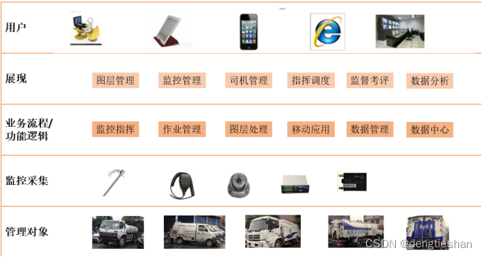 - 业务流程/功能逻辑:包括如监控指挥、作业管理、图层数据处理、移动应用、环卫数据管理以及环卫数据中心应用等。