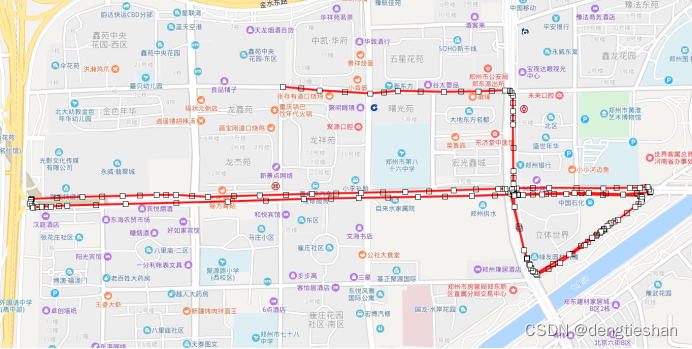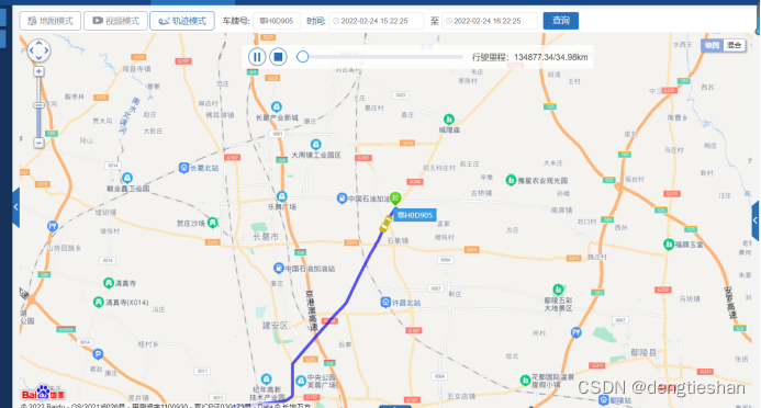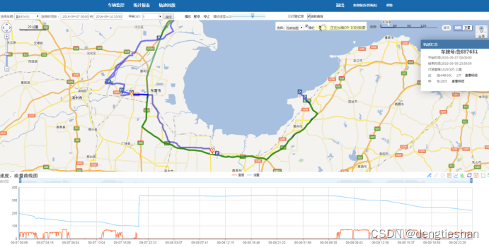 车载终端上存储的历史轨迹记录可以由管理中心通过无线方式按照时间段提取后存储于管理中心,轨迹点可以在管理中心电子地图上回放以重现车辆的行驶过程。车辆行驶路线轨迹回放图;