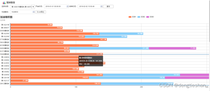 加油报表:根据实时油量数值,系统自动生成加油记录,并可与加油站实际加油记录(手动录入)比对,车辆在什么时间、什么地点、加了多少升油一目了然,柱状图与表格同时展示,更加直观易懂。