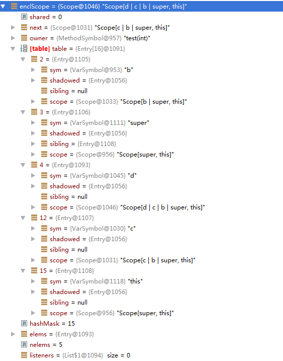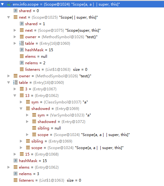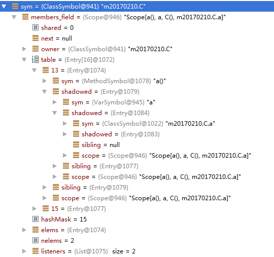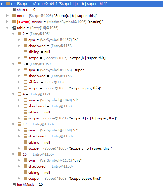 可以看到,对于类名为a和变量名为a的符号存储到了同一个hash桶中,通过shadowed形成了链。
