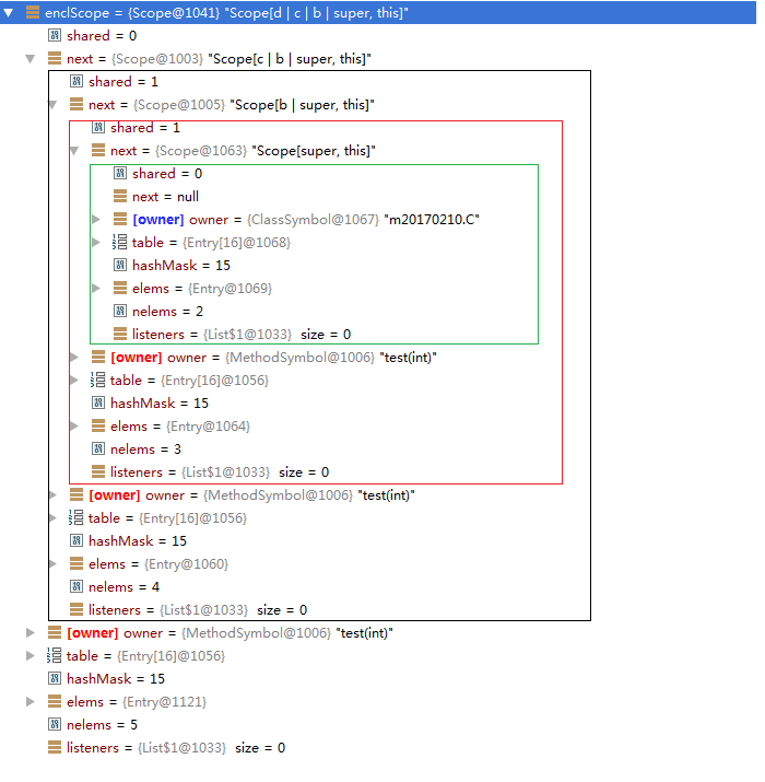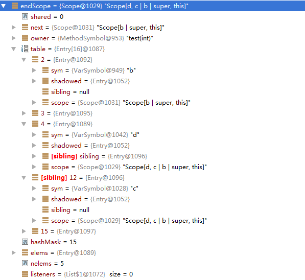 在方法内定义了两个变量c和d,通过如下截图可以清楚看到d的sibling指向c,因为c先定义的。