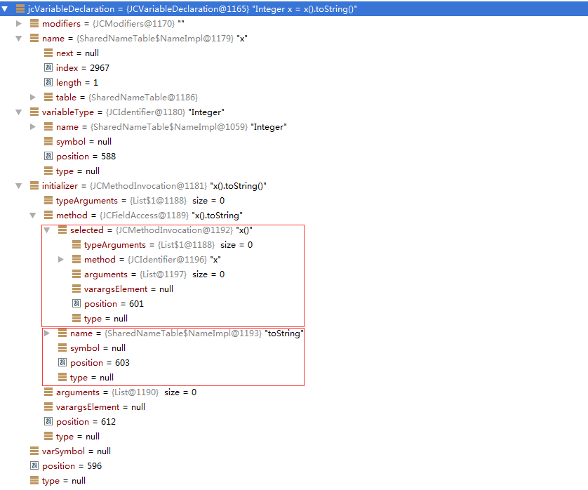 主要看代码Integer x = x().toString();的JCVariableDeclaration语法节点。