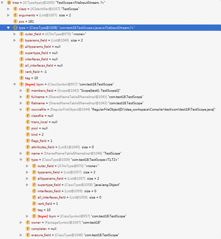 ClassSymbol的Symbol结点中,由于每个Symbol中都有TypeSymbol类型的属性,这个属性值为com.test18.TestScope<T1,T2>