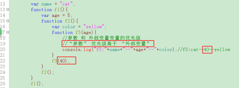 1 <!DOCTYPE html> 2 <html lang="en"> 3 <head> 4 <meta charset="UTF-8"> 5 <title>12-执行环境可以访问的变量信息</title> 6 <script type="text/javascript"> 7 //变量在当前、内部、深层环境都会起作用 8 9 var name="cat"; 10 function f1(){ 11 var age=5; 12 function f2(){ 13 var color="yellow"; 14 function f3(age){ 15 //参数 和外部变量的优先级 16 //“参数”优先级高于“外部变量” 17 console.log("f3:"+name+"--"+age+"--"+color);//f3:cat--40--yellow 18 } 19 f3(40); 20 } 21 f2(); 22 } 23 f1(); 24 </script> 25 </head> 26 <body> 27 28 </body> 29 </html>