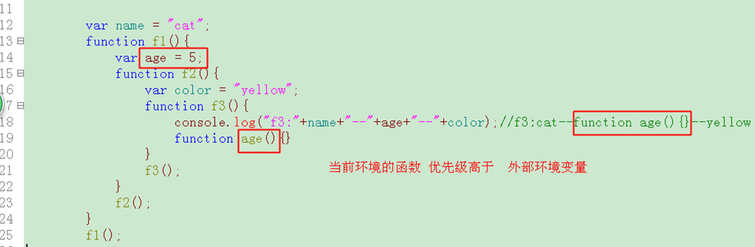 1 <!DOCTYPE html> 2 <html lang="en"> 3 <head> 4 <meta charset="UTF-8"> 5 <title>13-执行环境可以访问的变量信息</title> 6 <script type="text/javascript"> 7 //当变量在当前、内部、深层环境都会起作用 8 9 var name="cat"; 10 function f1(){ 11 var age=5; 12 function f2(){ 13 var color="yellow"; 14 function f3(){ 15 console.log("f3:"+name+"--"+age+"--"+color); //f3:cat--5--yellow 16 } 17 f3(); 18 } 19 function age(){} 20 f2(); 21 } 22 f1(); 23 </script> 24 </head> 25 <body> 26 27 </body> 28 </html>