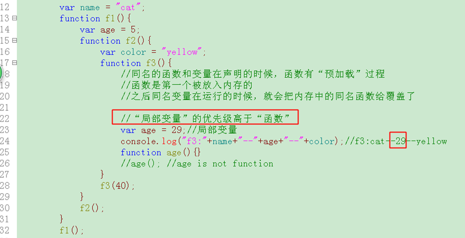 1 <!DOCTYPE html> 2 <html lang="en"> 3 <head> 4 <meta charset="UTF-8"> 5 <title>10-执行环境可以访问的变量信息</title> 6 7 <script type="text/javascript"> 8 //变量在当前、内部、深层环境都会起作用 9 10 var name="cat"; 11 function f1(){ 12 var age=5; 13 function f2(){ 14 var color="yellow"; 15 function f3(){ 16 //同名的函数和声明的时候,函数有“预加载”过程 17 //函数是第一个被放入内存的 18 //之后同名变量在运行的时候,就会把内存中的同名函数给覆盖 19 20 //“局部变量”的优先级高于“函数” 21 var age=29; 22 console.log("f3:"+name+"--"+age+"--"+color);//f3:cat--function age(){}--yellow 23 function age(){} 24 //age(); //age is not function 25 } 26 f3(40); 27 } 28 f2(); 29 } 30 f1(); 31 </script> 32 </head> 33 <body> 34 35 </body> 36 </html>