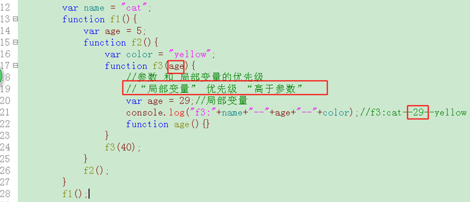 1 <!DOCTYPE html> 2 <html lang="en"> 3 <head> 4 <meta charset="UTF-8"> 5 <title>11-执行环境可以访问的变量信息</title> 6 <script type="text/javascript"> 7 //变量在当前、内部、深层环境都会起作用 8 9 var name="cat"; 10 function f1(){ 11 var age=5; 12 function f2(){ 13 var color="yellow"; 14 function f3(age){ 15 //参数 和 局部变量的优先级 16 //“局部变量” 优先级 “高于参数” 17 var age=29; //局部变量 18 console.log("f3:"+name+"--"+age+"--"+color);//f3:cat--29--yellow 19 function age(){} 20 } 21 f3(40); 22 } 23 f2(); 24 } 25 f1(); 26 </script> 27 </head> 28 <body> 29 30 </body> 31 </html>