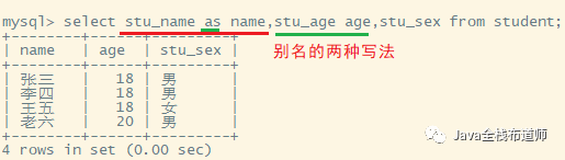列名为avg(stu_age) 看着有点怪怪,给他取个别名就一目了然: