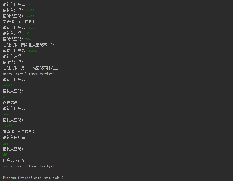 1 # 注册 2 f = open('users.txt', 'a+', encoding='utf-8') 3 f.seek(0) 4 user_info = eval(f.read())# 字符串转字典 5 i =0 6 while i<3: 7 i += 1 8 uname = input("请输入用户名:").strip() 9 upass = input("请输入密码:").strip() 10 passC = input("请确认密码:").strip() 11 if not uname or not upass or not passC: 12 print("注册失败,用户名或密码不能为空") 13 continue 14 if upass != passC: 15 print("注册失败,两次输入密码不一致") 16 continue 17 if uname in user_info: 18 print("注册失败,用户名已存在") 19 continue 20 print("恭喜你,注册成功!") 21 user_info[uname] ={'password':upass,'role':'1'} 22 f.seek(0) 23 f.truncate() 24 f.write(str(user_info)) 25 else: 26 print("sorry,register over 3 times bye-bye!") 27 f.close() 28 29 # 登录 30 fr = open('users.txt', 'r') 31 fr.seek(0) 32 user_info = eval(fr.read()) 33 j = 0 34 while j<3: 35 j +=1 36 uname = input("请输入用户名:\n").strip() 37 upass = input("请输入密码:\n").strip() 38 if not uname: 39 print("用户名不能为空") 40 continue 41 if not upass: 42 print("密码不能为空") 43 continue 44 if uname not in user_info: 45 print("用户名不存在") 46 continue 47 if upass != user_info[uname]['password']: 48 print("密码错误") 49 continue 50 print("恭喜你,登录成功!") 51 else: 52 print("sorry! login over 3 times bye-bye! ") 53 f.close()