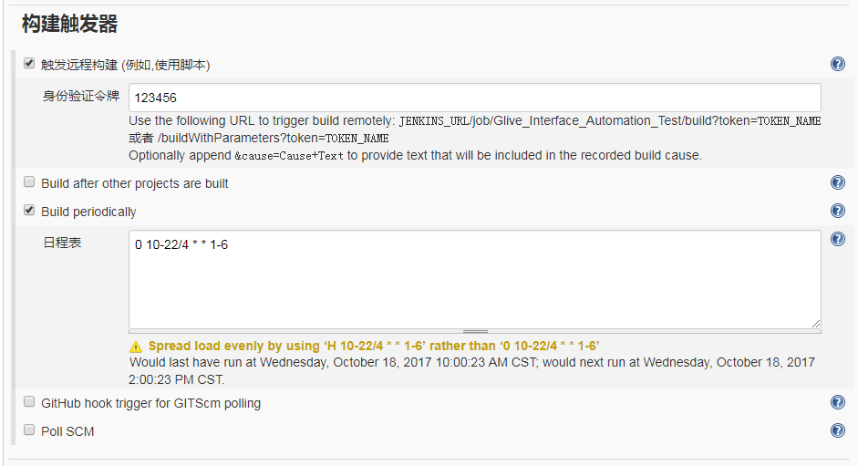 3、远程jenkins构建触发器需要添加触发远程构建身份令牌(本地机子触发该项目构建时的token)
