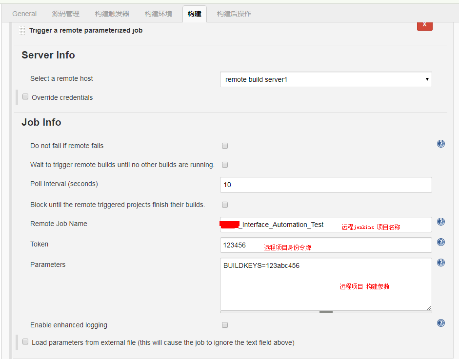 很多时候,我们会有这样的应用场景:一个jenkins上的项目构建后,需要远程触发另一台机子上的jenkins中某个项目的构建,可以通过Parameterized Remote Trigger Configuration 插件来实现。具体配置如下: