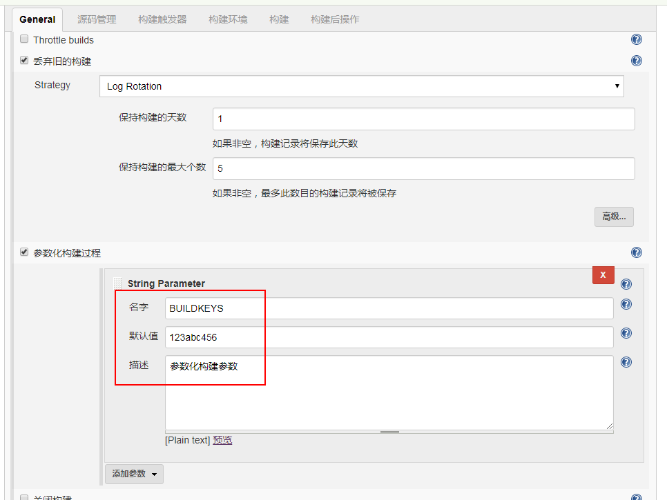 2、远程机子jenkins项目配置:需要选中参数化构建过程,并设置参数名和默认值(本地机子项目远程触发时需要用到该参数)
