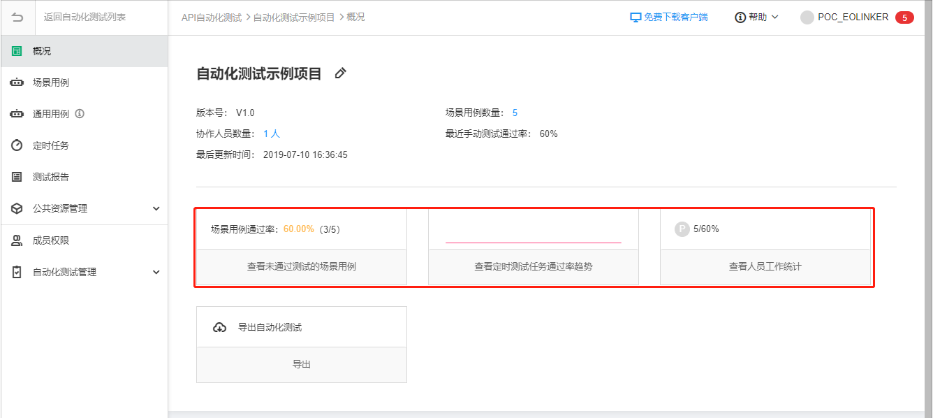 - 定时任务通过率趋势:最近定时任务的通过率百分比趋势(只有定时任务的用例通过率为100%时,该定时任务才算是通过)
