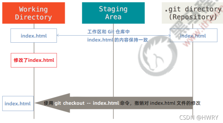 撤销对文件的修改指的是:把对工作区中对应文件的修改,还原成 Git 仓库中所保存的版本。