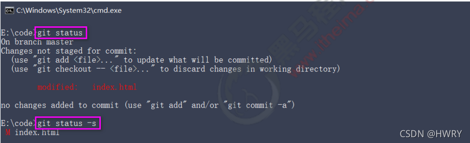 目前,index.html 文件已经被 Git 跟踪,并且工作区和 Git 仓库中的 index.html 文件内容保持一致。当我们修改了工作区中 index.html 的内容之后,再次运行 git status 和 git status -s 命令,会看到如下的内容:
