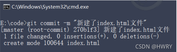 现在暂存区中有一个 index.html 文件等待被提交到 Git 仓库中进行保存。可以执行 git commit 命令进行提交,其中 -m 选项后面是本次的提交消息,用来对提交的内容做进一步的描述: