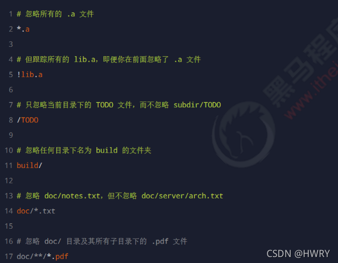 一般我们总会有些文件无需纳入 Git 的管理,也不希望它们总出现在未跟踪文件列表。 在这种情况下,我们可以创建一个名为 .gitignore 的配置文件,列出要忽略的文件的匹配模式。