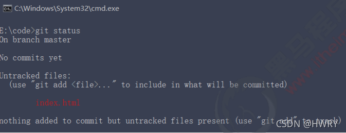 在状态报告中可以看到新建的 index.html 文件出现在 Untracked files(未跟踪的文件) 下面。