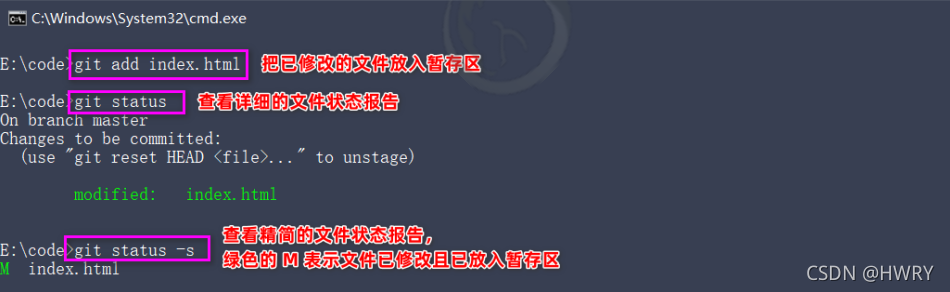 目前,工作区中的 index.html 文件已被修改,如果要暂存这次修改,需要再次运行 git add 命令,这个命令是个多功能的命令,主要有如下 3 个功效: