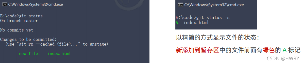 使用 git status 输出的状态报告很详细,但有些繁琐。如果希望以精简的方式显示文件的状态,可以使用如下